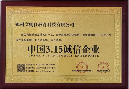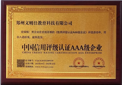 作为深耕教育科技领域的创新型企业,郑州文则仕教育科技有限公司始终将 “诚信立企、品质办学” 作为核心发展理念。此次获评 “AAA 级信用企业”,是对其在经营履约、服务质量、社会责任等维度的综合肯定 —— 该评级是国内企业信用评价的最高等级,意味着企业在商业信誉、合规运营等方面达到行业标杆水平;而 “3.15 诚信企业” 的称号,则是对其坚守消费者权益、践行透明化服务的直接褒奖。